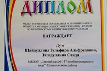 Музыкальный руководитель Шайдуллина Зульфира Альфредовна и воспитанница группы №6 Загидуллина Саида приняли участие в районном этапе городского конкурса вокальных дуэтов "Две звезды -2018" и награждены дипломом! Поздравляем!!!
