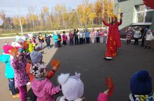 В детском саду прошли осенние утренники. В этом году они были организованы на свежем воздухе. Дети пели песни, водили хороводы, играли, а в гости к ним приходила сама Осень золотая, а также персонажи из сказок - Баба-Яга и старичок Лесовичок.