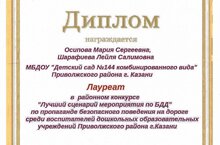 Воспитатели старшей группы № 1 Шарафиева Лейля Салимовна и Осипова Мария Сергеевна приняли участие в районном конкурсе "Лучший сценарий мероприятия по БДД" по пропаганде безопасного поведения на дороге среди воспитателей ДОУ Приволжского района г.Казани и стали лауреатами данного конкурса. Поздравляем!