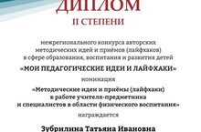 Поздравляем учителя физической культуры Зубрилину Татьяну Ивановну с присуждением 2 места на межрегиональном конкурсе авторских методических идей "Мои педагогические идеи и лайфхаки". Так держать!