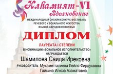 От всей души поздравляем лауреатов и дипломантов Международного онлайн конкурса-фестиваля речевого и вокального искусства языков народов Поволжья Илхамият-6. Наши звездочки: Шамилова Саида 2 класс, Фатихов Арслан 4 класс, Марданов Амир 4 класс, Зуев Владислав 4 класс, Федорова Амалия 1 класс, Гималтдинов Тамерлан 2 класс, Вяткин Вильдан 2 класс. Так держать!