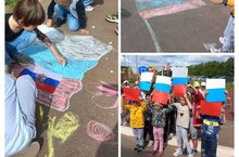 В ходе праздничного мероприятия дети соревновались в конкурсе рисунков на асфальте «Флаг Родины моей». Ребята узнали об истории появления Российского флага и его значимости для нашего государства. На прогулке они рисовали большой флаг мелками на асфальте.