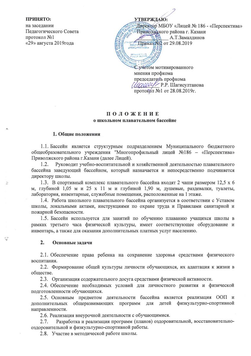 МБОУ «Лицей №186 – «Перспектива» Приволжского района г. Казани располагает спортивным комплексом плавательного бассейна, в который входят 2 чаши размером 12,5 х 6м и 25 х 11м, расположенные на 1 этаже. В лицее проходят уроки плавания в рамках предмета «Физическая культура» для обучающихся 2-9 классов. Также в лицее организованы секции «Обучение плаванию». «Плавание», которые охватывают категорию детей от 6 до 16 лет. Кроме того, образовательная организация сотрудничает с центром синхронного плавания «Жемчужина».
