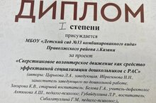 Творческий коллектив Детского сада на городском "Фестивале инклюзивных практик" представил опыт работы на тему: "Сверстниковое волонтерское движение как средство эффективной социализации дошкольников с РАС" в номинации "Лучшие инклюзивные практики в ДОУ" и был удостоен Диплома I степени.
