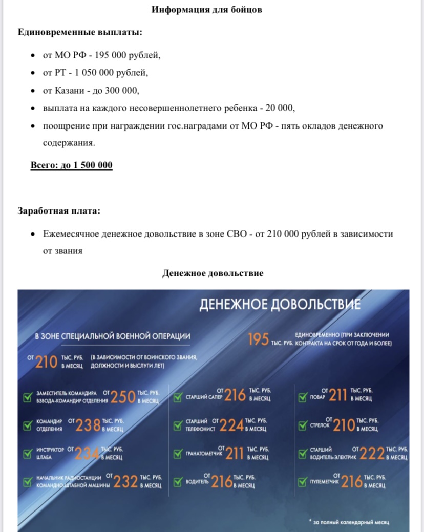 - Ежемесячное денежное довольствие в зоне СВО - от 210 000 рублей в зависимости от звания