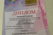С 14 по 17 февраля 2020года в Казани прошёл 124-й Международный фестиваль-конкурс детских, юношеских, молодежных, взрослых творческих коллективов и исполнителей "Невский Триумф" в рамках творческого проекта «Адмиралтейская звезда». Поздравляем Веронику Б. с заслуженным 1 местом и желаем дальнейших побед