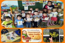 2 младшая группа №4 под руководством воспитателя Шарафеевой А.Б. сотворили дерево из ладошек и старшая группа №5 сделали коллективную работу, Воспитатель Тихонова Ю.В.