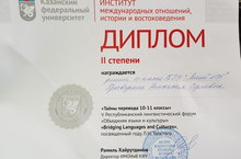 2 марта 2018 года ученики нашего лицея Гилемзянов Карим (10А) и Просвирнина Анастасия (10Б) приняли участие в V Республиканском лингвистическом форуме «Объединяя языки и культуры» (“Bridging Languagesand Cultures”). Настя награждена дипломом II степени в секции «Тайны перевода 10-11 классы», с чем мы ее и поздравляем! (учитель Саженская Ю.Е.)