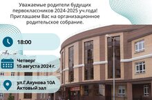 Уважаемые родители будущих первоклассников 2024-2025 учебного года! Приглашаем вас на организационное родительское собрание, которое состоится 15 августа 2024 года в 18.00 в актовом зале лицея.