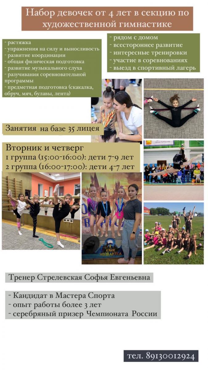 Набор девочек от 4 лет в секцию по художественной гимнастике.Занятия на базе 35 лицея.Вторник и четвергІ группа (15:00-16:00): дети 7-9 лет2 группа (16:00-17:00): дети 4-7 летОбращаться по тел. 89130012924 (Софья Евгеньевна)Подробнее смотреть -
