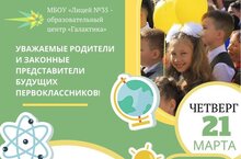 Сегодня, 21 марта в 18.00, на базе Лицея № 35 пройдет собрание для родителей будущих первоклассников на тему "Приемная кампания по зачислению в 1 класс на 2024-2025 учебный год".