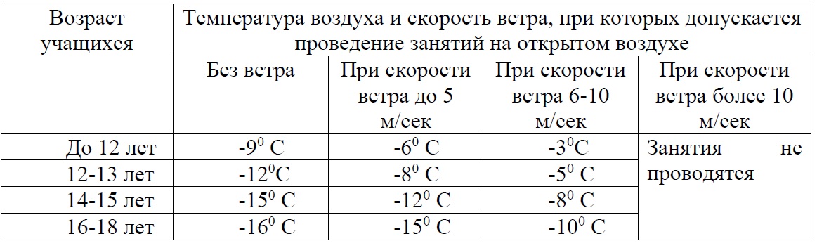Проведение занятий по физической культуре в зимний период на открытом воздухе допускается при следующих погодных условиях: