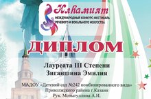 Воспитанница подготовительной группы Зиганшина Эмилия стала Лауреатом III степени на Междунароном фестивале-конкурсе речевого и вокального искусства "Илхамият".