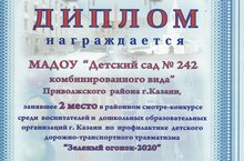 Поздравляем коллектив детского сада со 2 местом в районном смотре-конкурсе среди воспитателей дошкольных образовательных организацией г.Казани по профилактике детского дорожно-транспортного травматизма "Зеленый огонек-2020".