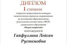 Поздравляем нашего педагога Гайфуллину Лейсан Рустемовну с победой в открытом Всероссийском конкурсе педагогических проектов, направленных на достижение образовательных результатов в соответствии с ФГОС дошкольного образования "Радуга открытий".