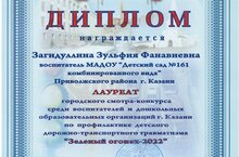 Поздравляем воспитателя Загидуллину Зульфию Фанавиевну занявшую 2 место на районном этапе городского смотр-конкурса среди ДОО и их воспитателей Вахитовского и Приволжского районов г.Казани по профилактике ДДТТ "Зеленый огонек - 2022".