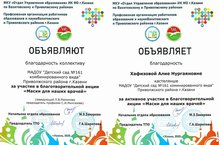 МКУ «Отдел Управления образования» ИК МО г.Казани по Вахитовскому и Приволжскому районам и Профсоюзная организация работников образования и науки Вахитовского и Приволжского районов г.Казани объявили благодарность коллективу МАДОУ «Детский сад 161» и кастелянше Хафизовой А.Н. за активное участие в благотворительной акции «Маски для наших врачей» .