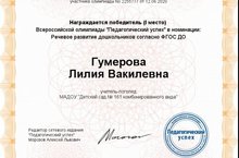 Поздравляем нашего педагога с победой во Всероссийской олимпиаде "Педагогический успех" - номинация "Речевое развитие дошкольников согласно ФГОС ДО".