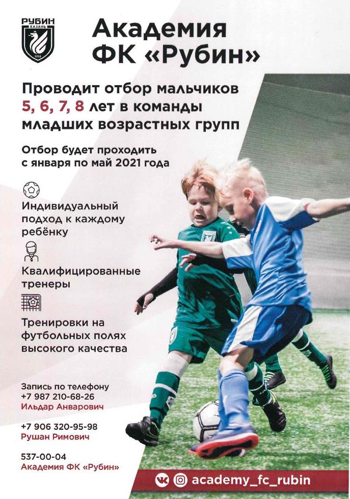 Опубликовано: 20.01.2021Академия футбольного клуба "Рубин" проводит отбор мальчиков 5, 6, 7, 8 лет в команды младших возрастных групп. Отбор будет проходить с января по май 2021 года.