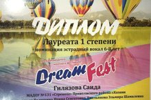 Поздравляем воспитанницу детского сада Гилязову Саиду с победой в Международном конкурсе –фестивале «Drem Fest», которая была награждена дипломом лауреата 1 степени. Спасибо большое музыкальным руководителям Валишиной Ирине Сунгатовне и Емельяновой Эльмире Шамилевне за хорошую подготовку. Дальнейших побед и успехов!!!