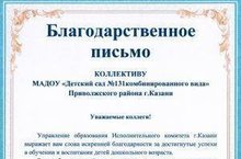 1 апреля коллектив детского сада был отмечен Благодарственным письмом начальника УО ИК МО г. Казани И.Г. Хадиуллина за высокий уровень в подготовки и организации мероприятия в рамках Республиканской коллегии "Развитие системы дошкольного образования в Республике Татарстан".