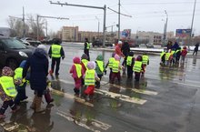 Сегодня малышей, наряженных в светоотражающие жилеты, автоинспекторы повели на прогулку по городу.
