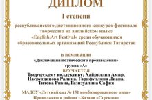 Спешим поделиться радостью!!! В начале февраля 2021 года Стрекоза приняла участие в республиканском конкурсе-фестивале творчества на английском языке «English Art Festival». Мы рискнули заявиться сразу в двух номинациях «Исполнение вокального произведения» и «Декламация поэтического произведения»! И вот подведены итоги конкурса, и мы очень рады, что наши обе работы так высоко оценило компетентнейшее жюри, присвоив 1 и 2 место среди 242 образовательных организаций РТ, заявившихся на данный конкурс.