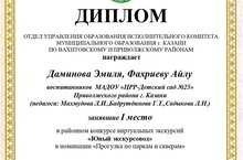 В рамках Года народного искусства и культурного наследия Российской Федерации был проведен районный конкурс виртуальных экскурсий "Юный экскурсовод". В конкурсе от нашего детского сада учавствовали наши воспитанники подготовительной группы Даминов Эмиль и Фахриева Айла. Под руководством педагогов Садыковой Л.Н., Бадрутдиновой Г.Т. и Махмудовой Л..И. ребята заняли первое место в номинации "Прогулка по паркам и скверам".