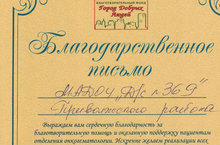 Коллектив МАДОУ "Детский сад № 369" совместно с родителями воспитанников детского сада организовал благотворительную акцию "Спешите делать добро!". Все собранные подарки были переданы в отделение онкогематологии ДРКБ в Фонд "Город Добрых Людей".