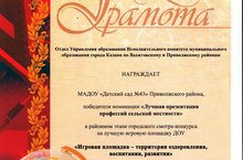 Наш детский сад принимал участие в городском смотре-конкурсе на лучшую игровую площадку ДОУ "Игровая площадка - территория оздоровления, воспитания, развития" и стал победителем в номинации "Лучшая презентация профессий сельской местности". Это победа всего дружного коллектива детского сада, так как каждый педагог и специалист принял непосредственное участие в разработке данного проекта. Мы молодцы!!!