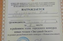 Коллектив педагогов, родителей и детей от всей души поздравляет Кузнецову Юлию воспитанницу подготовительной группы за победу в районном конкурсе цтецо прозы "Звездный билет"!!!!!! Администрация выражает благодарность музыкальному руководителю Ивановой Лилие Анатольевне за подготовку к конкурсу! МОЛОДЦЫ!!!!! ТАК ДЕРЖАТЬ!!!!!!