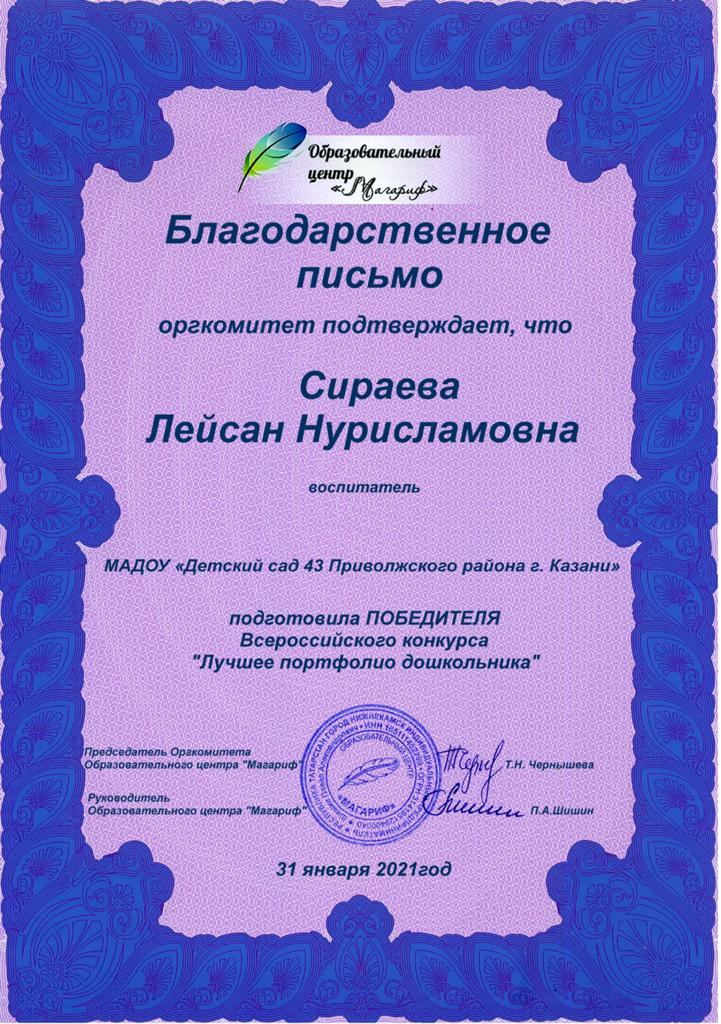- Благодарственное письмо подготовки победителя в конкурсе "Лучшее портфолио дошкольника"