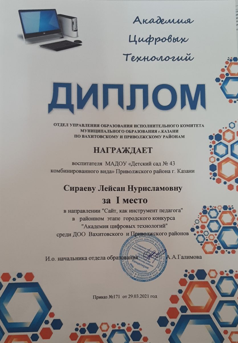- Диплом 3 место в городском конкурсе педагогического мастерства "Академия цифровых технологий в ДОУ"