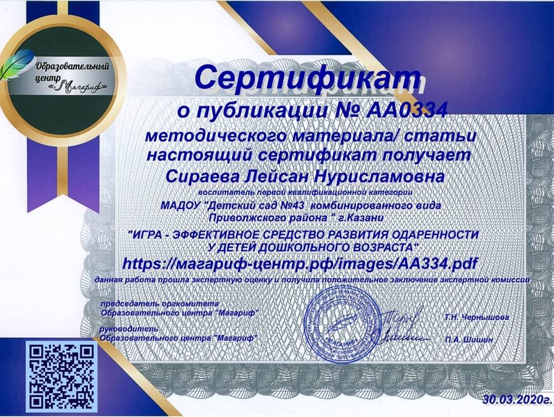- Диплом за активное участие в мероприятиях, проводимых журналом "Салават Купере", обмен опытом в проведении мастер-классов и воспитательной работы с детьми мл.школьного возраста