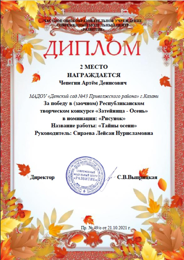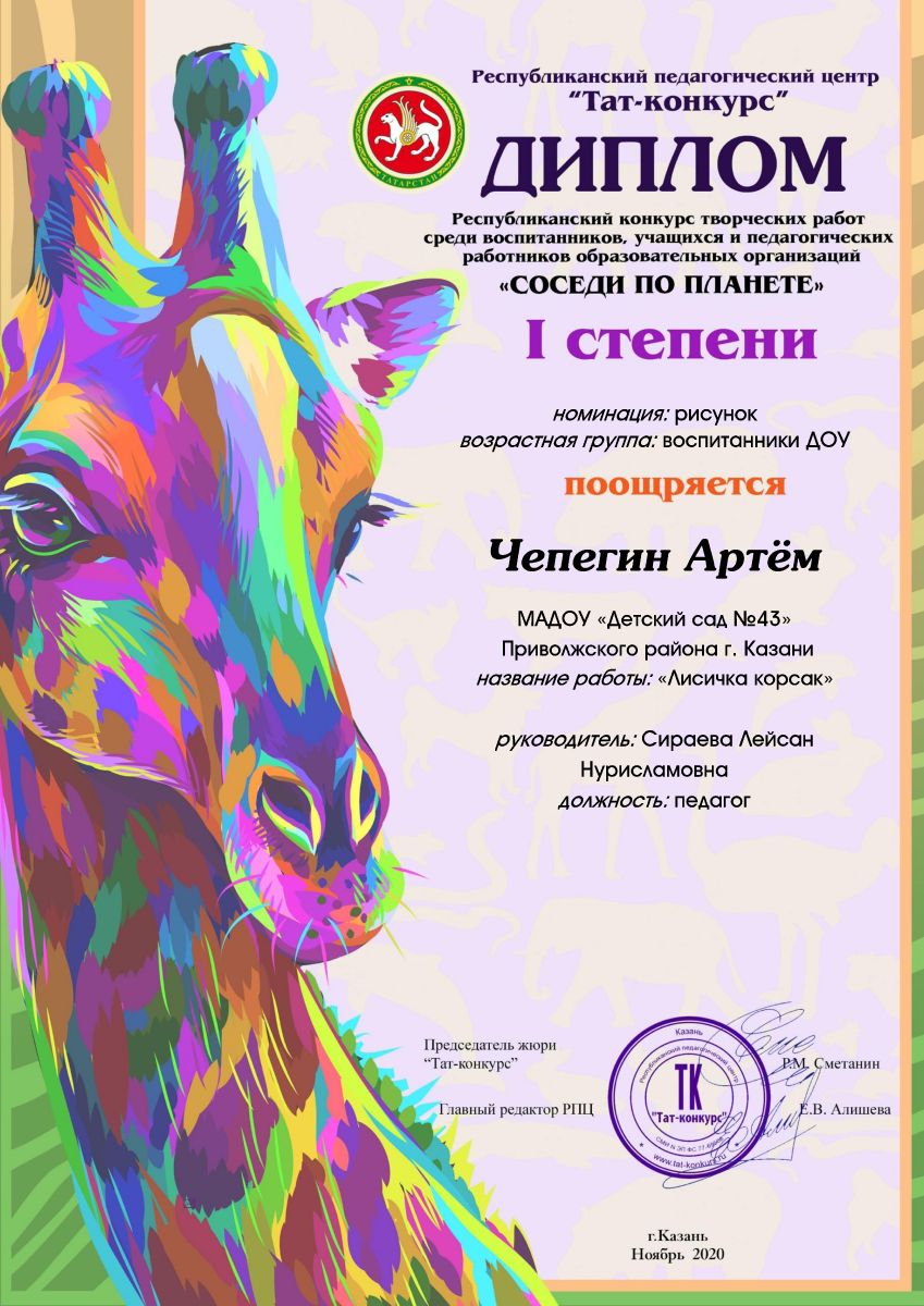 - Диплом 1 место Чепегин Артём Республиканский ТАТ-КОНКУРС "Осень разноцветная"