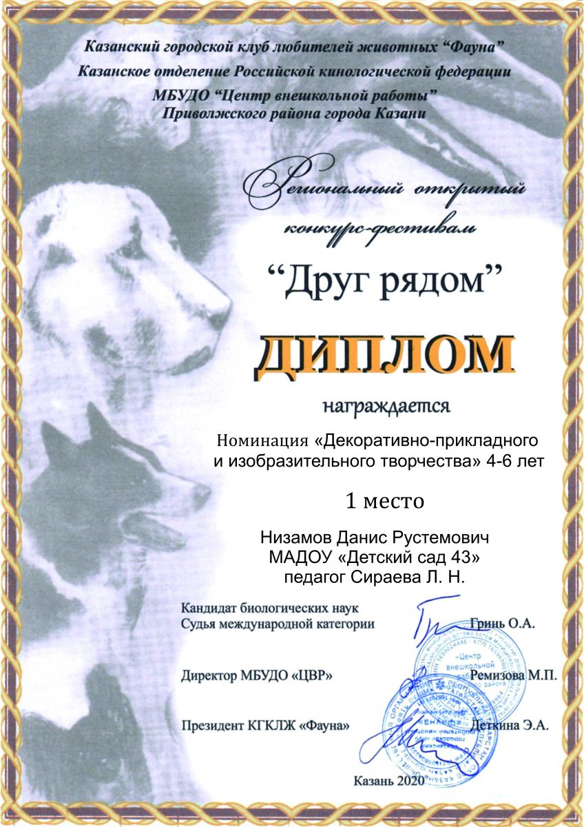 - Диплом 1 место Низамов Данис 8 гр в Региональном конкурс-фестиваль Друг рядом