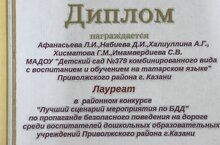 Педагоги детского сада: Афанасьева Любовь Ивановна, Набиева Диляра Ильясовна, Халиуллина Альфия Гатауловна, Хисматова Галина Михайловна, Имамвердиева Светлана Вкиторовна приняли участие в районном конкурсе "Лучший сценарий мероприятия по БДД" по пропаганде безопасного поведения на дороге среди воспитателй дошкольных образовательных учреждений Приволжского района г.Казани и были награждены дипломом лауреата.Балалар бакчасы педагоглары: Афанасьева Любовь Ивановна, Нәбиева Диләрә Ильясовна, Хәлиуллина Әлфия Гатаул кызы, Хисмәтова Галина Михайловна, Имамвердиева Светлана Вкиторовна Казан шәһәре Идел буе районының мәктәпкәчә мәгариф учреждениеләре тәрбиячеләре арасында юлда үз-үзеңне куркынычсыз тотуны пропагандалау буенча "Юл хәрәкәте иминлеге кагыйдәләре буенча чараның иң яхшы сценарие" район конкурсында катнаштылар лауреат дипломы белән бүләкләнделәр. -