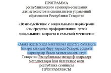 11 ноября заведующий детского сада Галлямшина Э.Ф. приняла участие в республиканском семинаре-совещании для методистов и специалистов управлений образования Республики Татарстан «Взаимодействие с социальными партнерами как средство профориентации детей дошкольного возраста в сельской местности» в п.г.т.Богатые Сабы.11 ноябрь көнне балалар бакчасы мөдире Галләмшина Э.Ф. Татарстан Республикасы мәгариф идарәләренең методистлар һәм белгечләре өчен “Авыл җирендә мәктәпкәчә яшьтәге балаларга һөнәри юнәлеш бирү чарасы буларак социаль партнерлар белән хезмәттәшлек” республика семинар-киңәшмәсендә катнашты. -