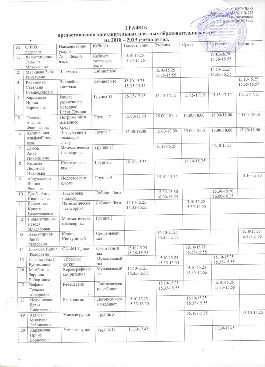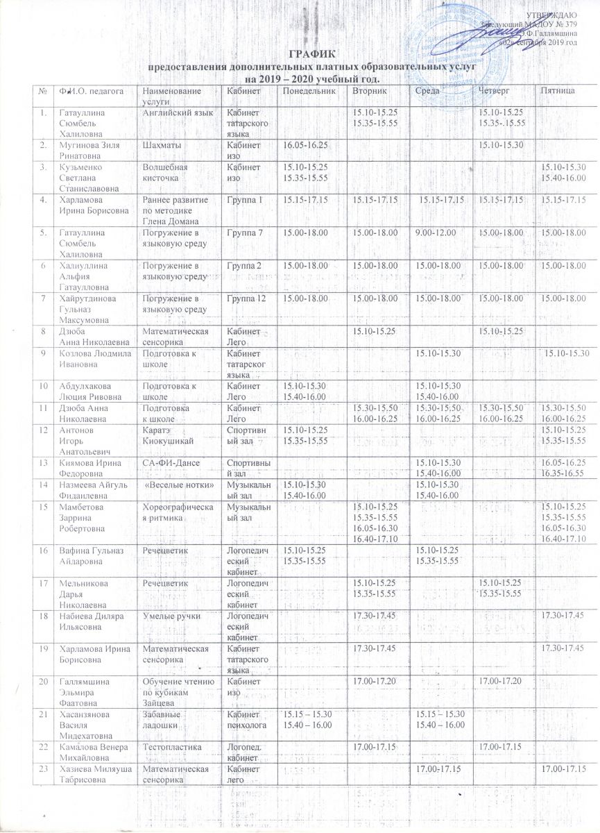 Расписание-график предоставления дополнительных платных услуг / Түләүле өстәмә хезмәтләр күрсәтү расписаниесе һәм графигы