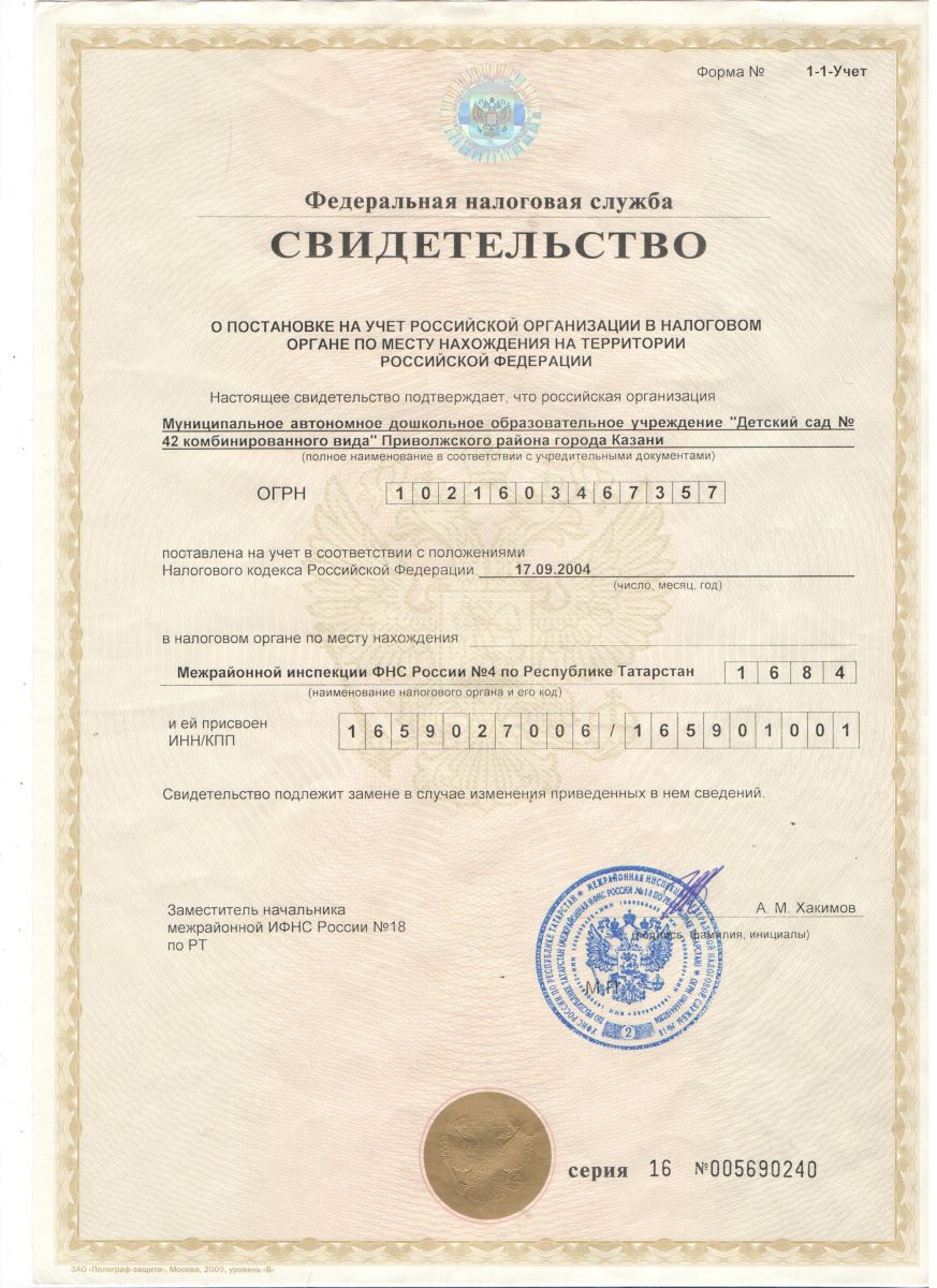 Свидетельство о постановке на учёт в налоговом органе