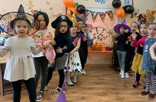 Воспитатель, Марина Владимировна познакомила с историей возникновения этого праздника, а потом они слепили паучков для украшения фотозоны для Хэллоуина.Выучили песню «Frik and Freak», пополнили словарный запас по данной теме. -