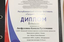 Поздравляем Лотфуллину Камилу, студентку 3 курса группы №537Д/9, занявшую 1 место в Республиканском конкурсе - фестивале «Патриоты России!»