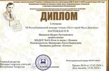 Поздравляем Манапову Лялю Радиковну и Манапова Мурата с дипломом 1 степени в конкурсе чтецов "Поэт-герой Муса Джалиль" -