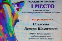 Поздравляем Ильясову Венеру Шамилевну, принявшую участие в Республиканском конкурсе творческих работ среди педагогических работников образовательных организаций "Соседи по планете", занявшая 1 место ! Желаем творческих успехов !