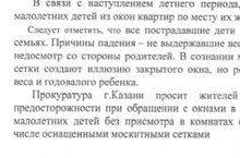 В связи с наступлением летнего периода,участились факты падения малолетних детей из окон квартир по месту их жительства. Следует отметить, что все пострадавшие дети проживали в благополучных семьях. Причины падения- не выдержавшие веса ребенка москитные сетки и недосмотр со стороны родителей. В созании малолетних детей москитные сетки создают иллюзию закрытого окна, но реально они не выдерживают даже вес и годовалого ребенка. Прокуратра г Казанипросит жителей города соблюдать меры предосторожности при обращении с окнами в летний период, не оставлять малолетних детей без присмотра в комнате с открытыми окнами , в том числе оснащенных москитными сетками.