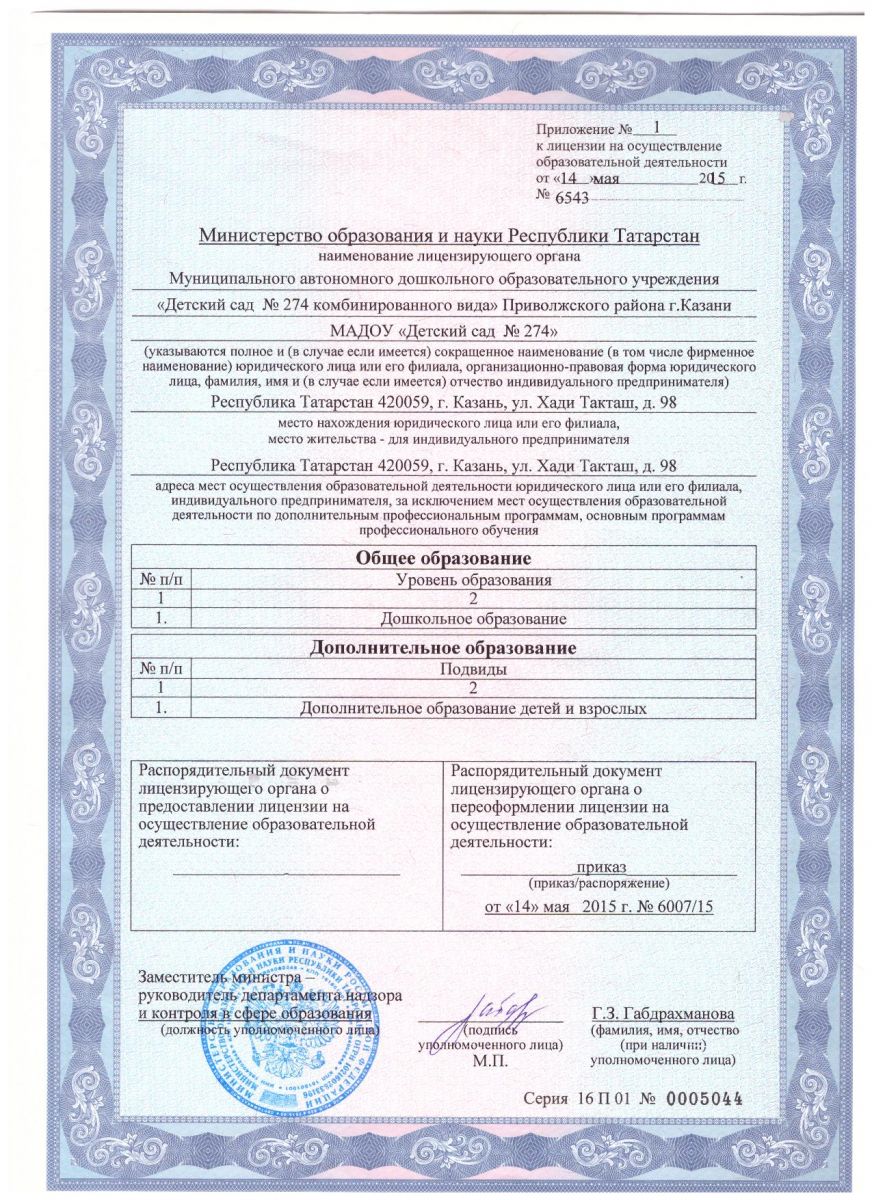 Приложение к лицензии на осуществление образовательной деятельности от 14 мая 2015года №6543