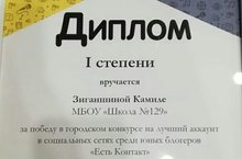 Диплом I степени за победу в городском конкурсе за лучший аккаунт в социальных сетях среди юных блогеров “Есть Контакт” Комитета по делам детей и молодежи г.Казани у учащейся 10А класса Зиганшиной Камили! Педагог-организатор Харитонова Р.И.