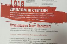 Поздравляем ученика 11А класса Мухаметзянова Рената с Дипломом III степени в Конкурсе исследовательских краеведческих работ учащихся по теме "Гражданская война: историческая память и наследие. К 100-летию событий Гражданской войны в Приволжье". Конкурс проходил в ГИАХМЗ "Остров-град Свияжск". Учитель истории Капитова Ч.Г.