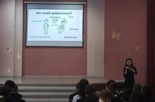 В рамках проведения Недели добра, психолог школы Ерохина В.С. провела интерактивную лекцию для учащихся 6В, 7А, 7Л и 8Л классов на тему "Добровольчество без границ". Школьники узнали кто может быть добровольцем, ознакомились с направлениями добровольческой деятельности. Валентина Сергеевна рассказаа про мероприятия и проекты добровольческой деятельности в г. Казань.