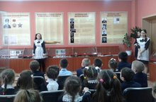 Экскурсию в школьном музее сегодня для учащихся 1В класса провели учащиеся 8-10 классов: Сатторова Аниса, Галеева Азалья, Стурова Аделина и Замалиев Раян. Школьники узнали о истории п. Мирный, ветеранах поселка - участниках Великой Отечественной войны 1941-1945гг, узнали факты из истории школы, осмотрели все экспонаты музея. Руководитель музея Капитова Ч.Г.